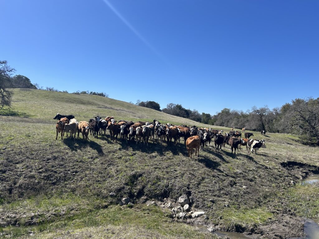 The primary goal of the Mitsui Ranch Preserve is researching ways of improving and revitalizing ecosystem function such as soil formation, soil water holding capacity, filtration of pollutants by groundwater, nutrient cycling, and recovery from historical disturbances. Since the arrival of Europeans more than 200 years ago, California’s grasslands have undergone a complete phase change, from a landscape dominated by perennial bunchgrasses, to one dominated by introduced annual grasses. Perennial grasses are much better at providing the ecosystem services described above, but they don’t compete well with the alien annual grasses brought here by European settlers. On the Mitsui Ranch Preserve we set out to re-establish a perennial grass-dominated rangeland. We use three major tools to achieve that goal: cattle grazing; prescribed fire; and re-establishing native perennial grasses by planting seeds after implementing prescribed fire.